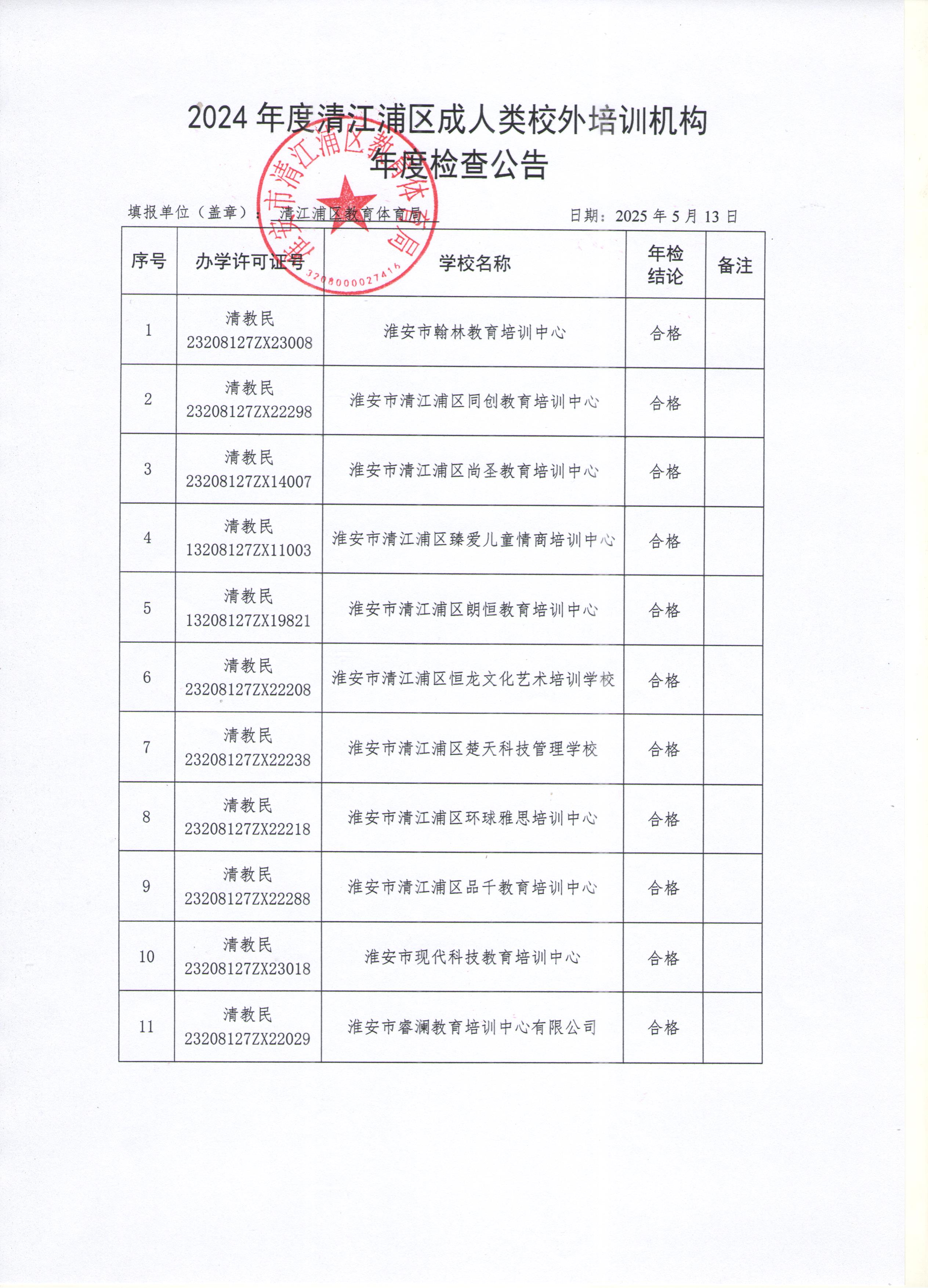 2024年度清江浦区成人类校外培训机构年度检查公告